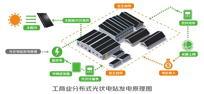 工商业分布式光伏电站,是指利用分散式资源,装机规模较小的、布置在用户附近的发电系统,以满足特定用户用电需求,支持现存配电网的经济运行,或者同时满足这两个方面的要求。其基本设备包括光伏电池组件、光伏方阵支架、直流汇流箱、直流配电柜、并网逆变器、交流配电柜等设备,另外还有供电系统监控装置和环境监测装置。