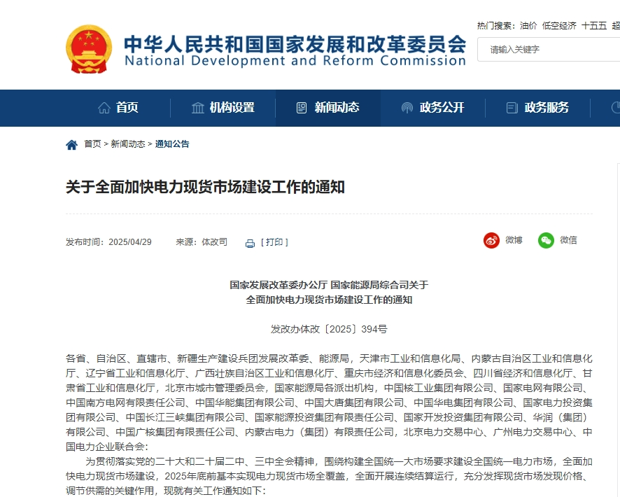 国家发展改革委、国家能源局联合发布电力市场化改革攻坚方案,推动我国电力现货市场建设全面提速。根据《关于加快推进电力现货市场建设工作的通知》,南方区域电力现货市场需全面启动连续结算试运行,京津冀地区要突破体制机制障碍,加快构建电力市场体系并启动模拟试运行。跨省域交易体系将重点突破省间壁垒,推动发电侧主体直接参与省间现货交易,同步开展售电企业与终端用户跨省市场化交易试点,构建"发电-输配-消费"全链条市场化运作机制。