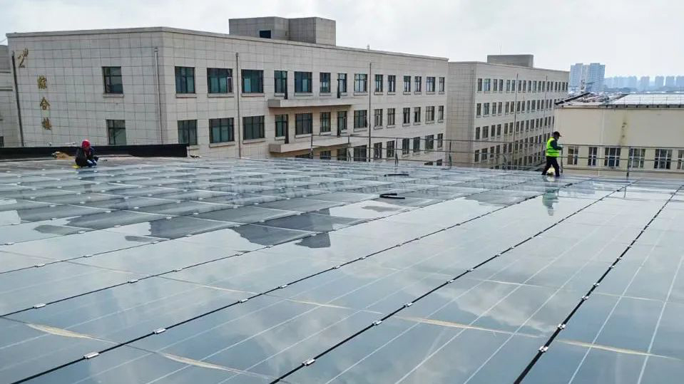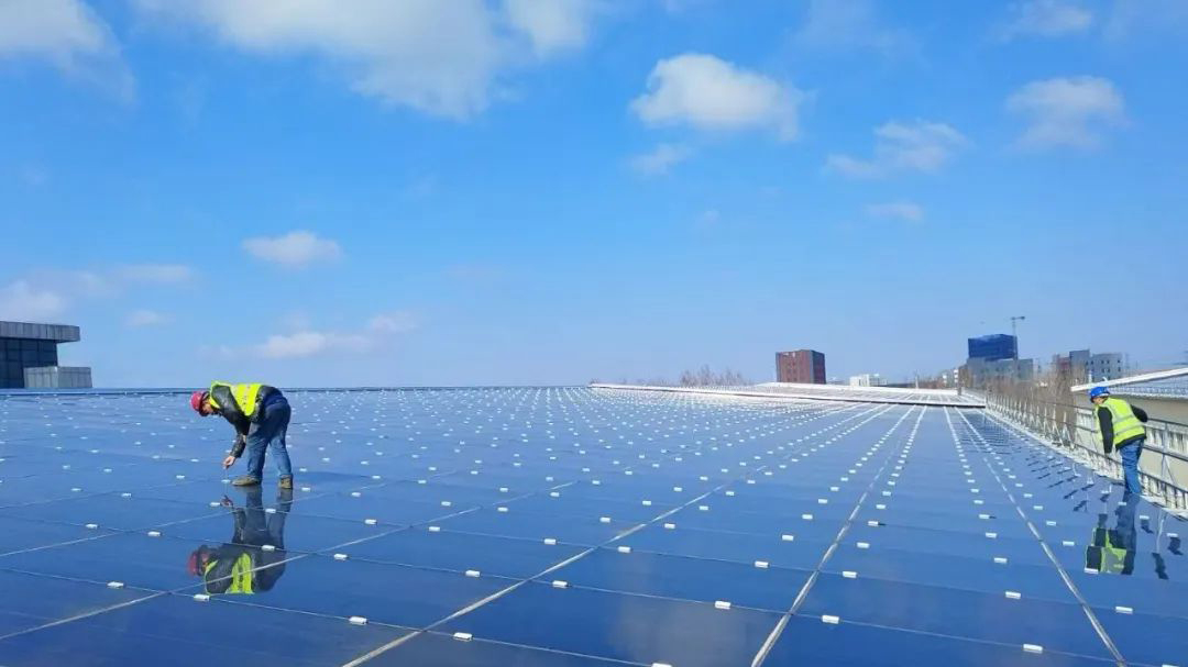 项目概况:该电站位于黑龙江省哈尔滨市松北区松北街道,屋顶有效安装面积约为23145.6㎡。项目总装机容量为2.94MWp。于2025年5月4日成功并网发电,电站主要由光伏组件阵列、逆变器、变压器、监控系统等设备构成。其中,光伏组件采用250w碲化镉发电玻璃,具有高效光电转换性能;配备26台110kw逆变器、1台33kw逆变器和1台50kw逆变器,实现直流电到交流电的高效转换;智能监控系统可实时采集各设备运行状态及发电数据,为电站稳定运行提供有力保障。