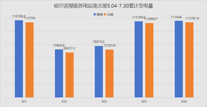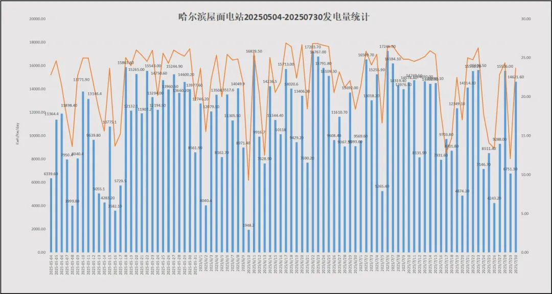 运行数据:在第三期运行测试中,哈尔滨碲化镉屋面(BIPV)光伏电站累计发电1012434.3千瓦时,等效小时累计达到344.37小时。单日最高发电量达17246.5千瓦时,等效发电时数达5.87小时。如图1所示(展示2025年5月4日至7月30日发电数据),电站发电量与当日辐照度呈现显著正相关性。值得注意的是,由于碲化镉薄膜组件分别安装在厂房屋顶南/北坡,受朝向影响,南坡发电量普遍高于北坡。