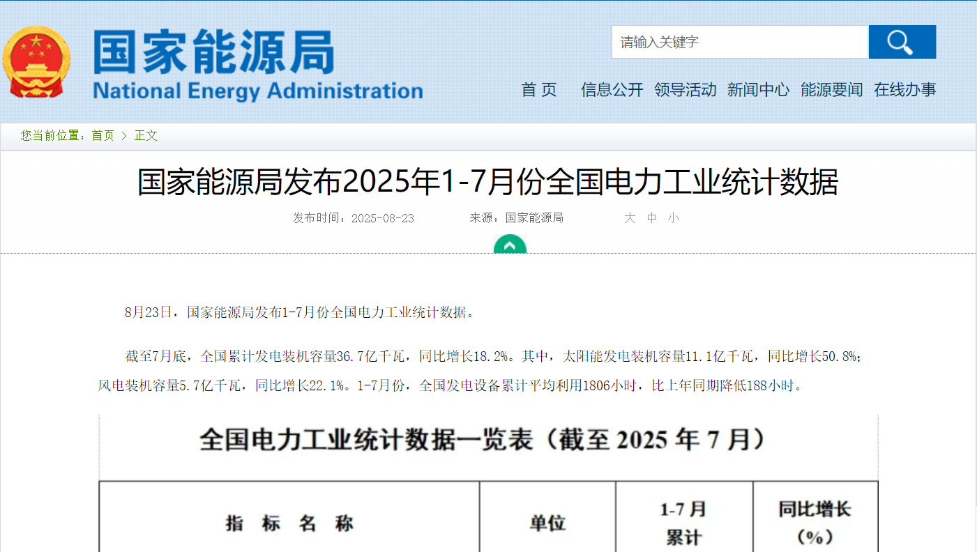 8月23日,国家能源局发布全国电力工业统计数据显示,截止2025年7月,全国累计发电装机容量36.7亿千瓦,同比增长18.2%。其中,太阳能发电装机容量11.1亿千瓦,同比增长50.8%;风电装机容量5.7亿千瓦,同比增长22.1%。