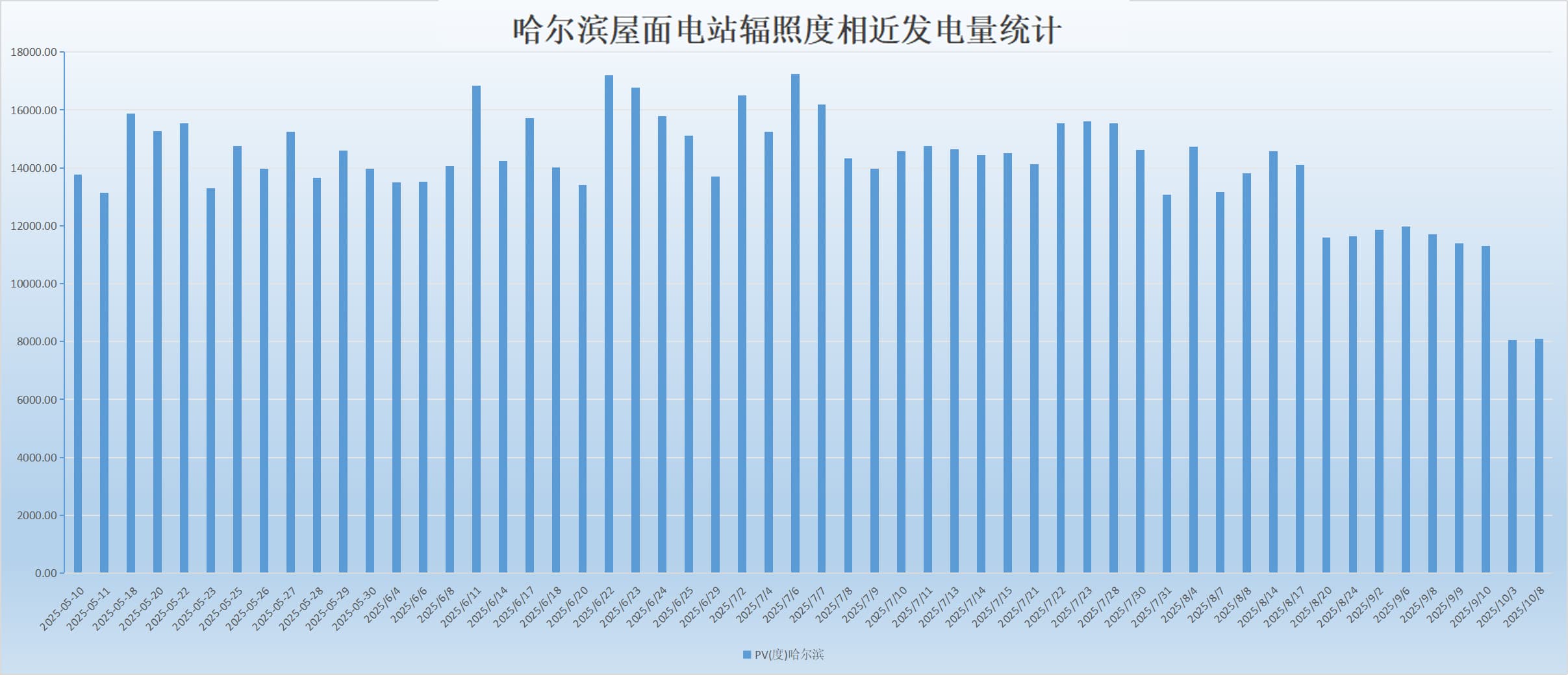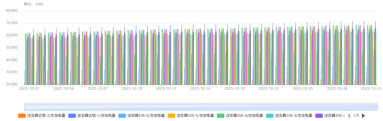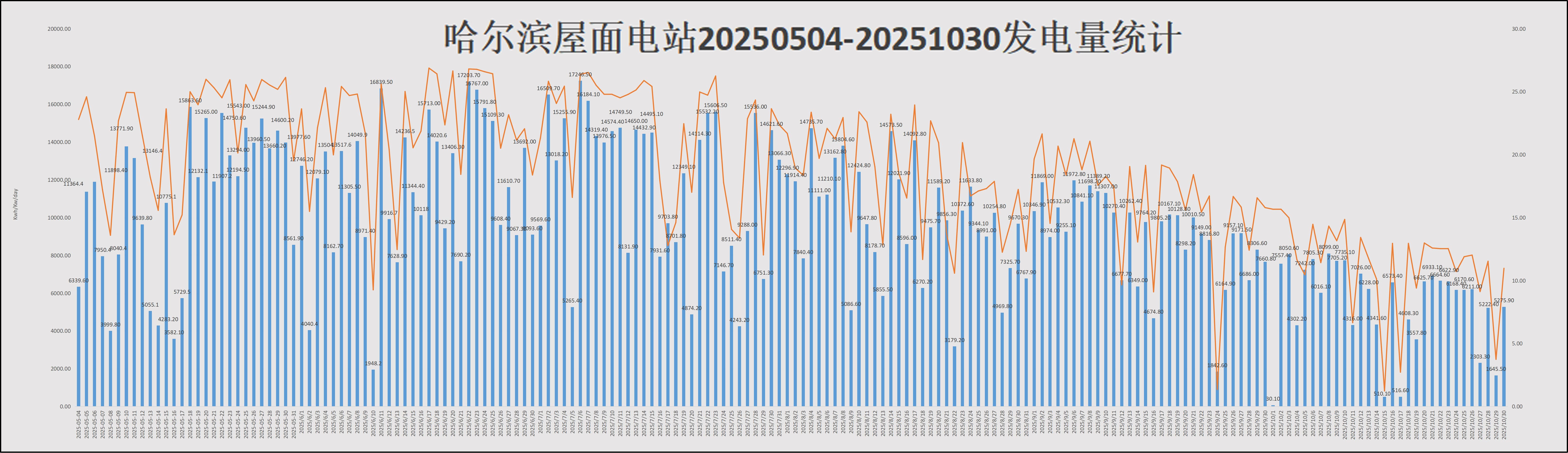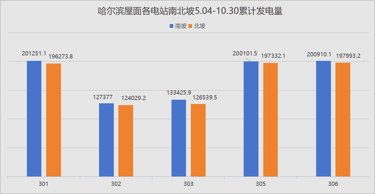 如图1所示(展示2025年5月4日至10月30日发电数据),电站发电量与当日辐照度呈现显著正相关性。值得注意的是,由于碲化镉薄膜组件分别安装在厂房屋顶南/北坡,受朝向影响,南坡发电量普遍高于北坡。