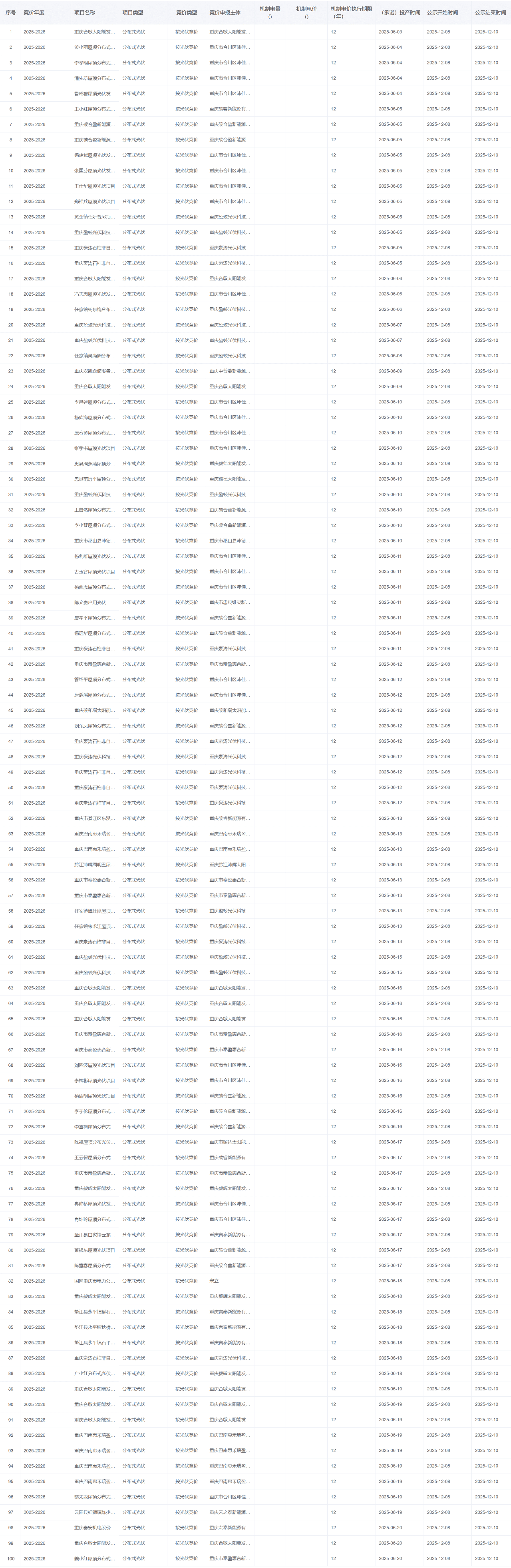 10月29日,重庆市发改委、重庆市经信委、重庆市能源局印发《关于2025—2026年度新能源机制电价竞价工作有关事项的通知》,根据文件,