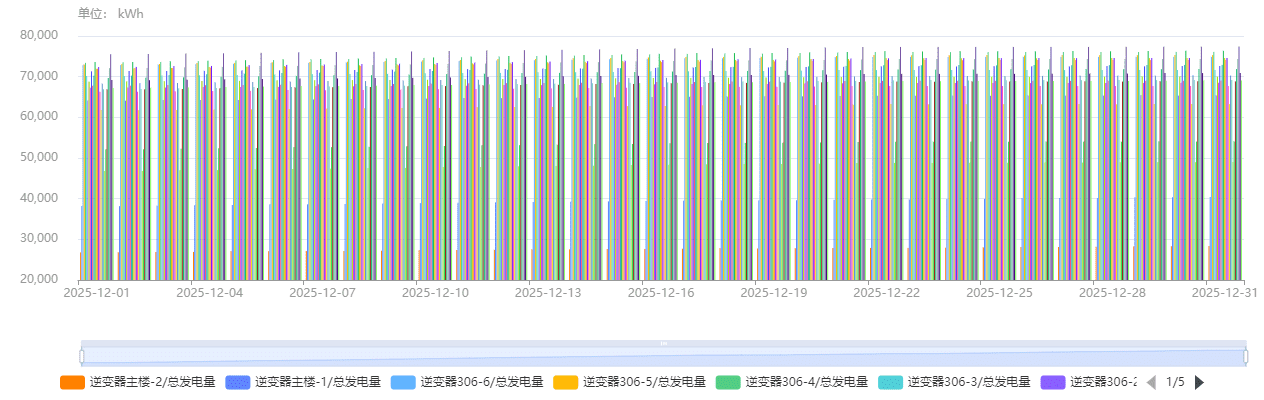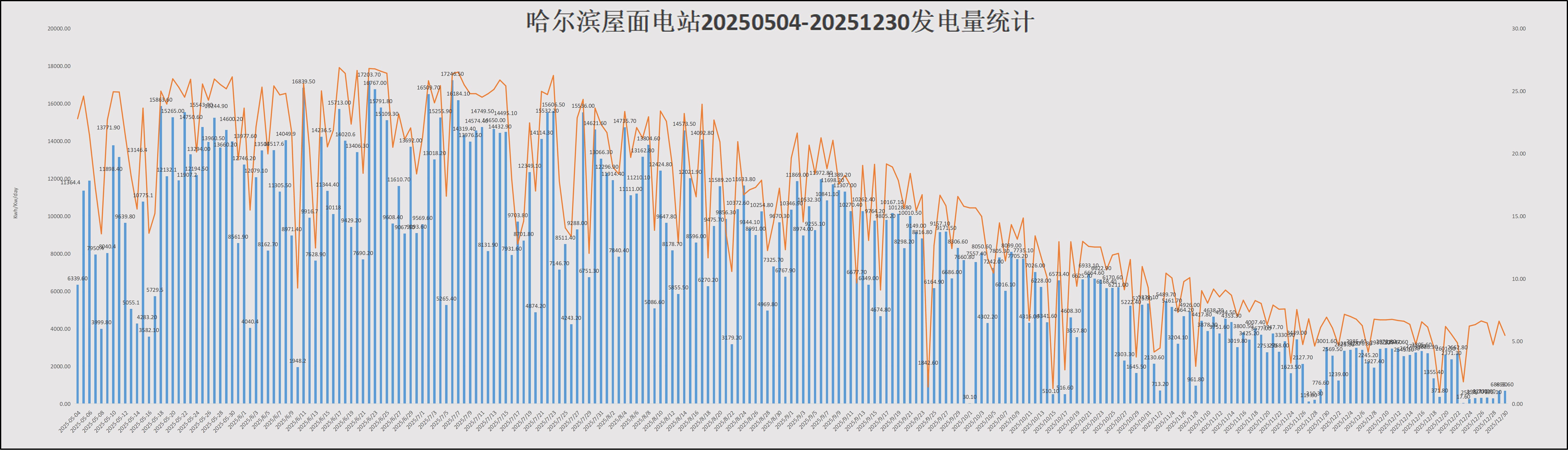 运行数据:在第八期运行测试中,哈尔滨碲化镉屋面(BIPV)光伏电站累计发电1922343.00千瓦时,等效小时累计达到653.86小时。单日最高发电量达17246.5千瓦时,等效发电时数达5.87小时。如图1所示(展示2025年5月4日至12月30日发电数据),电站发电量与当日辐照度呈现显著正相关性。值得注意的是,由于碲化镉薄膜组件分别安装在厂房屋顶南/北坡,受朝向影响,南坡发电量普遍高于北坡。