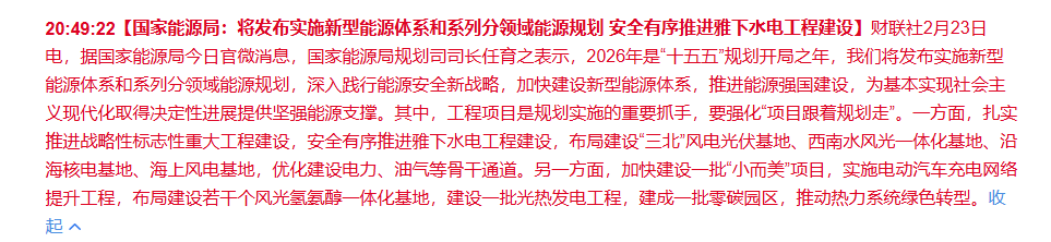 2月23日,国家能源局:今年要正式发布实施新型能源体系和一系列分领域能源规划,全力推进能源强国建设。这不仅是纸上蓝图,更是一份沉甸甸的“项目开工令”。
