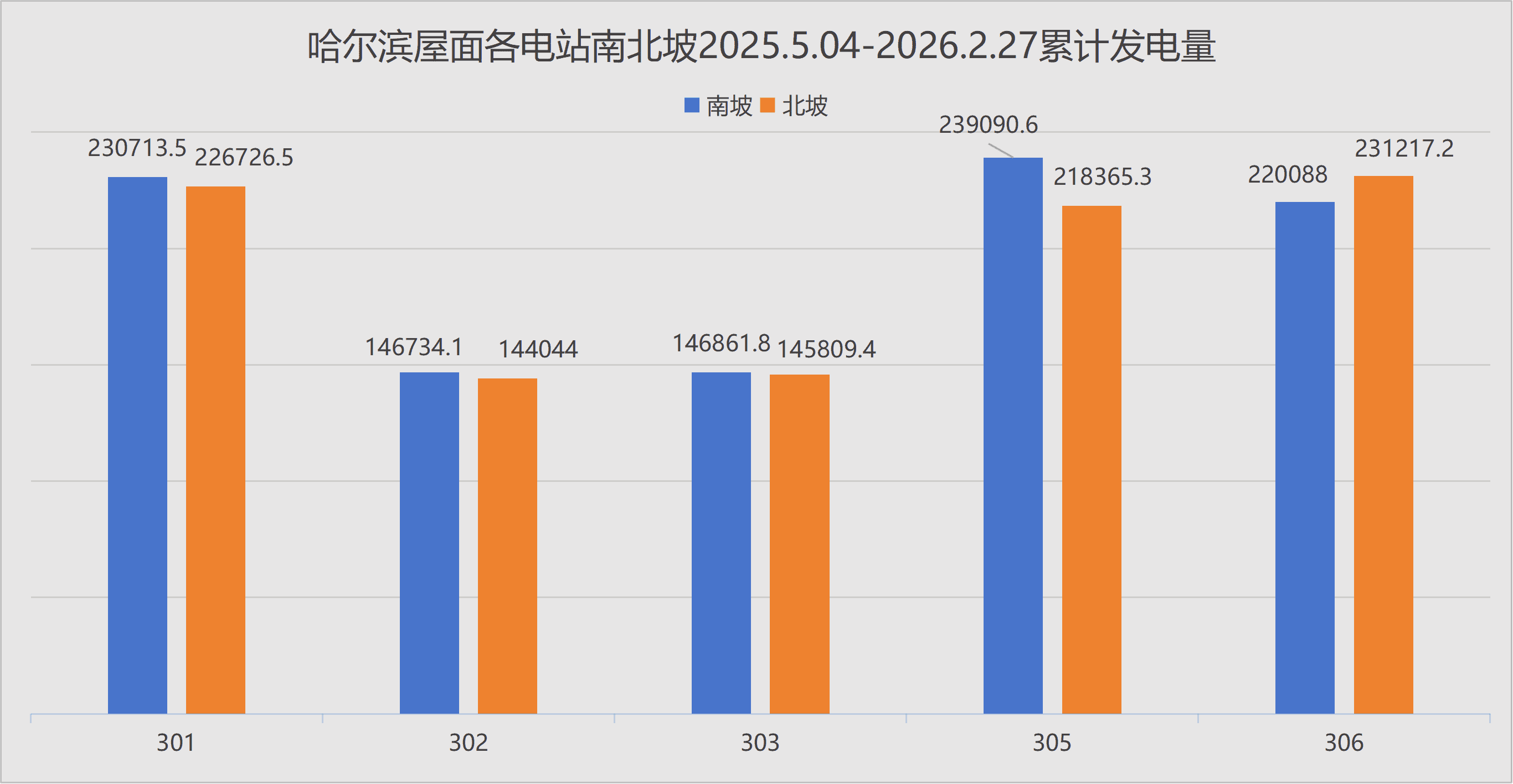 如图1所示(展示2025年5月4日至2026年2月27日发电数据),电站发电量与当日辐照度呈现显著正相关性。值得注意的是,由于碲化镉薄膜组件分别安装在厂房屋顶南/北坡,受朝向影响,南坡发电量普遍高于北坡。
