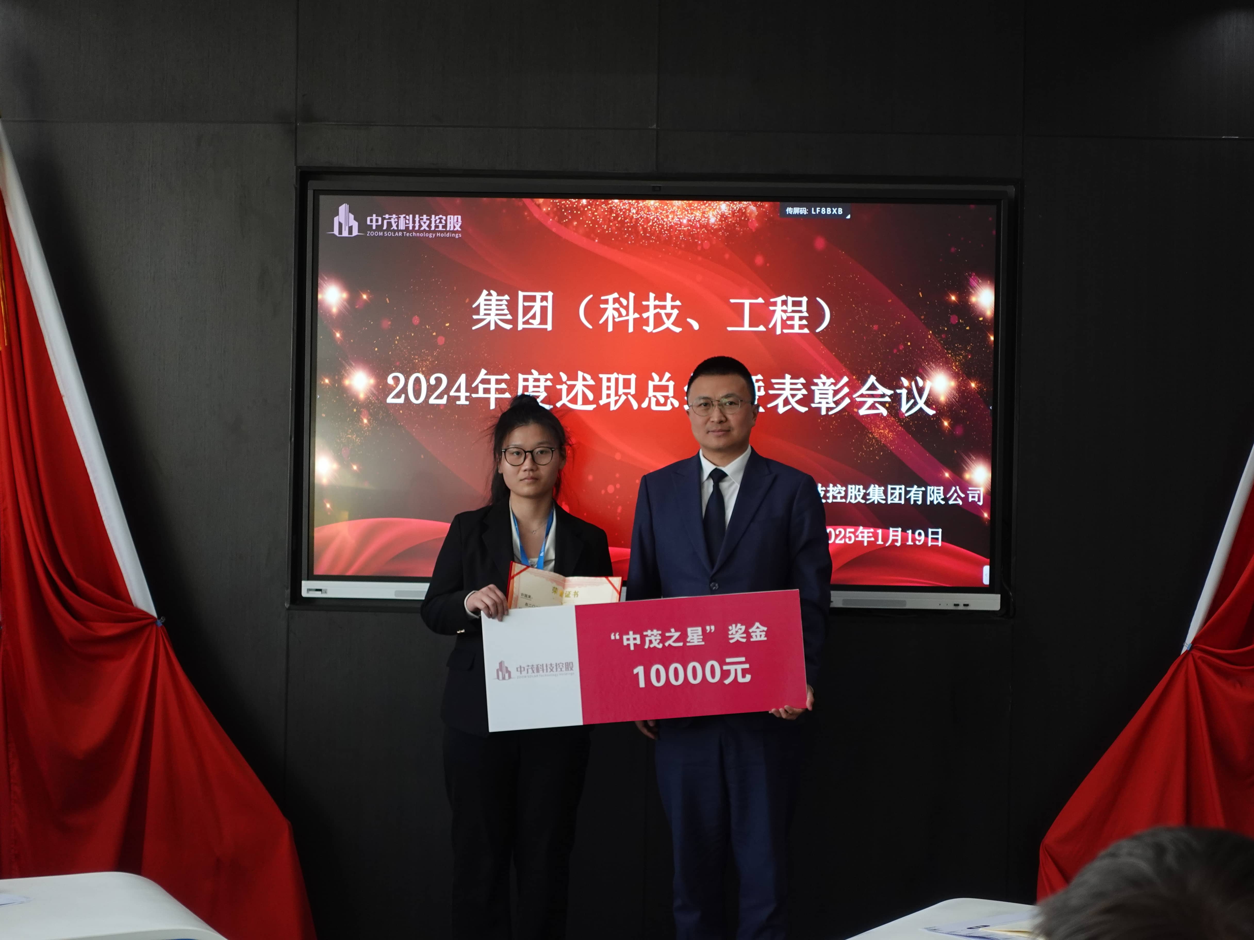 最后颁发中茂之星奖,许国英上台领奖,丁总上台颁发荣誉证书及现金10000元并合影留念。这些荣誉不仅是对个人与团队努力的肯定,更是对光伏行业未来无限可能的期许。让我们以荣誉为动力,继续引领光伏技术革新,照亮绿色地球的梦想之路。