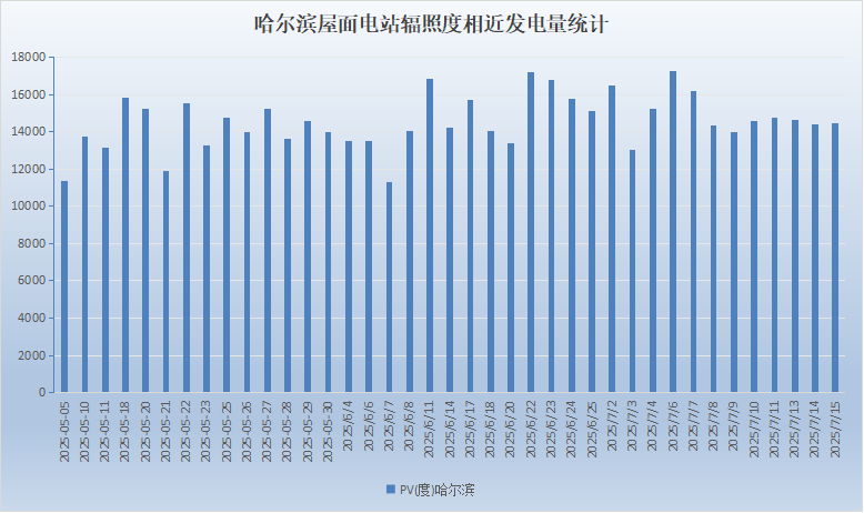 运行数据:在第三期运行测试中,哈尔滨碲化镉屋面(BIPV)光伏电站累计发电1012434.3千瓦时,等效小时累计达到344.37小时。单日最高发电量达17246.5千瓦时,等效发电时数达5.87小时。如图1所示(展示2025年5月4日至7月30日发电数据),电站发电量与当日辐照度呈现显著正相关性。值得注意的是,由于碲化镉薄膜组件分别安装在厂房屋顶南/北坡,受朝向影响,南坡发电量普遍高于北坡。