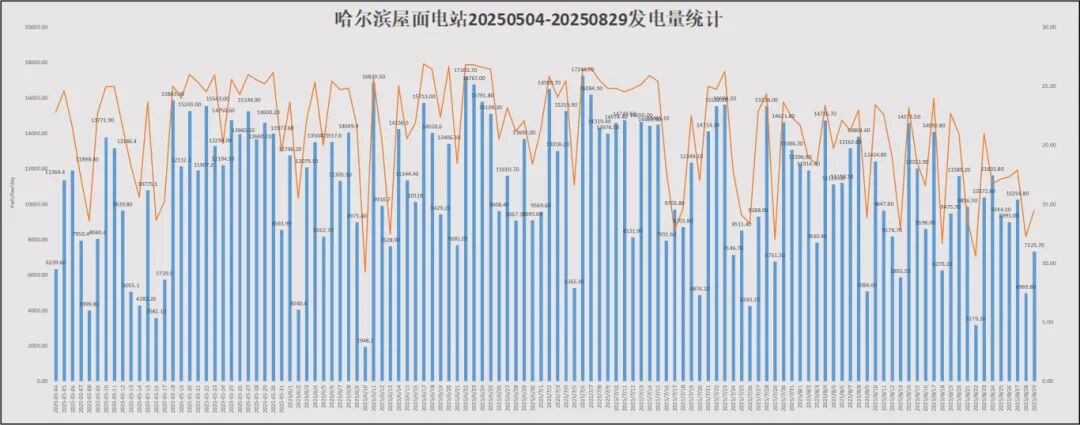 运行数据:在第四期运行测试中,哈尔滨碲化镉屋面(BIPV)光伏电站累计发电1315316.50千瓦时,等效小时累计达到447.39小时。单日最高发电量达17246.5千瓦时,等效发电时数达5.87小时。如图1所示(展示2025年5月4日至8月29日发电数据),电站发电量与当日辐照度呈现显著正相关性。值得注意的是,由于碲化镉薄膜组件分别安装在厂房屋顶南/北坡,受朝向影响,南坡发电量普遍高于北坡。