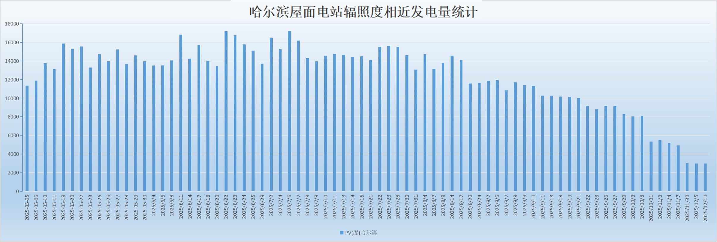 运行数据:在第八期运行测试中,哈尔滨碲化镉屋面(BIPV)光伏电站累计发电1922343.00千瓦时,等效小时累计达到653.86小时。单日最高发电量达17246.5千瓦时,等效发电时数达5.87小时。如图1所示(展示2025年5月4日至12月30日发电数据),电站发电量与当日辐照度呈现显著正相关性。值得注意的是,由于碲化镉薄膜组件分别安装在厂房屋顶南/北坡,受朝向影响,南坡发电量普遍高于北坡。