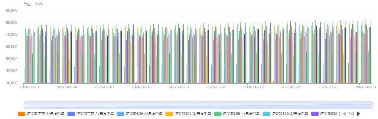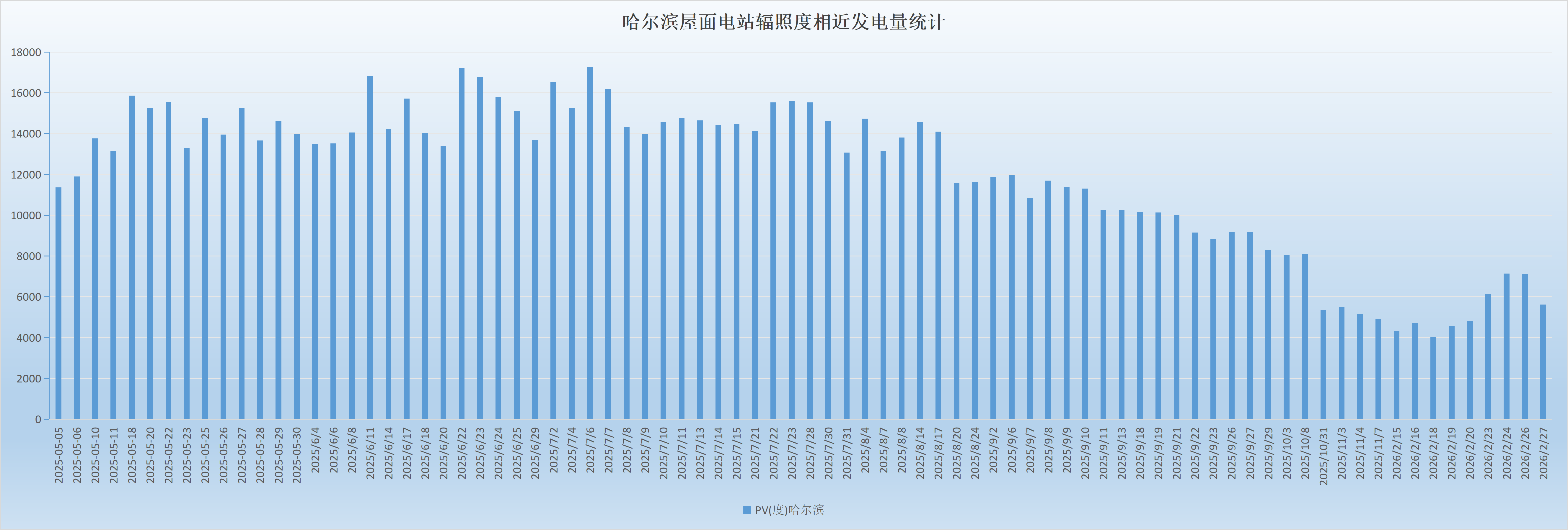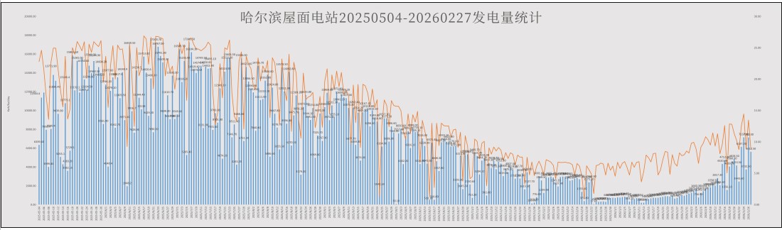 如图1所示(展示2025年5月4日至2026年2月27日发电数据),电站发电量与当日辐照度呈现显著正相关性。值得注意的是,由于碲化镉薄膜组件分别安装在厂房屋顶南/北坡,受朝向影响,南坡发电量普遍高于北坡。